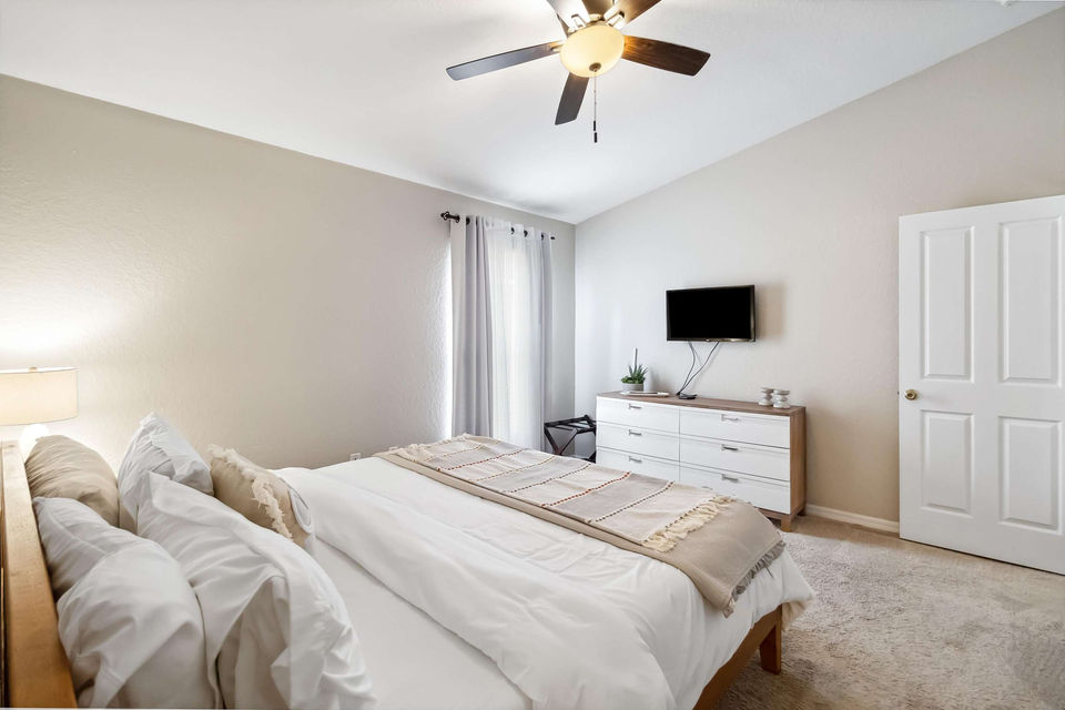 Indulge in the serene ambiance of the first primary bedroom, where a plush king-sized bed awaits to envelop you in comfort. This spacious suite is designed for relaxation, featuring high-quality linens, elegant decor, and a private ensuite bathroom. Unwind with your favorite shows on the cable and Roku-equipped TV, or simply enjoy the peace and privacy of your personal retreat. This room offers a restful sanctuary to recharge for another exciting day at the parks.